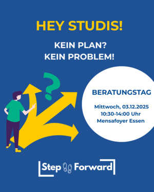am 03. Dezember 2025 findet der Beratungstag für alle, die im Studium nach Orientierung suchen, im Mensafoyer am Campus Essen statt. Die Veranstaltung richtet sich an Studierende, die sich mit Fragen zur Studienwahl, zum Studienverlauf oder zu möglichen Veränderungen im Studium beschäftigen.